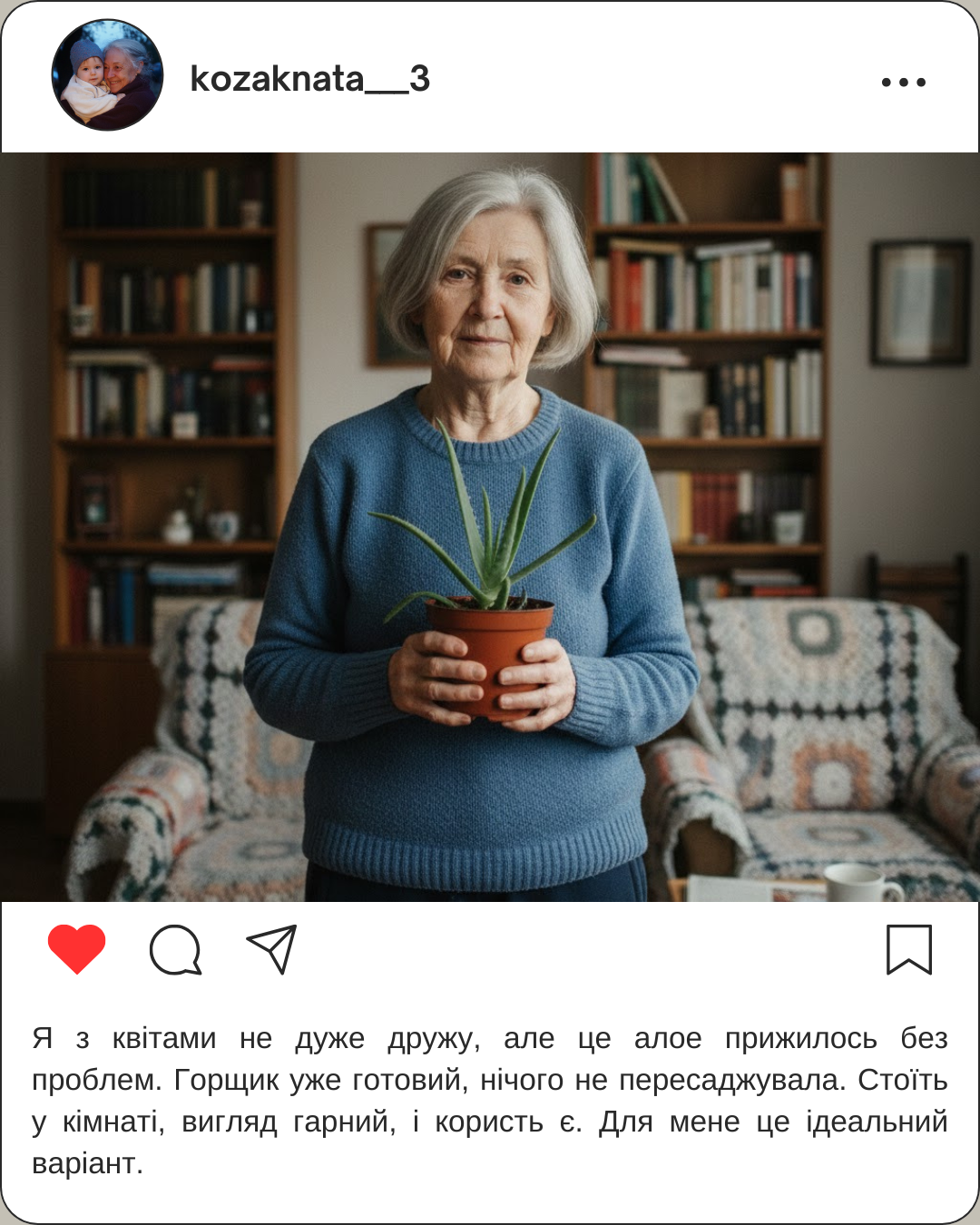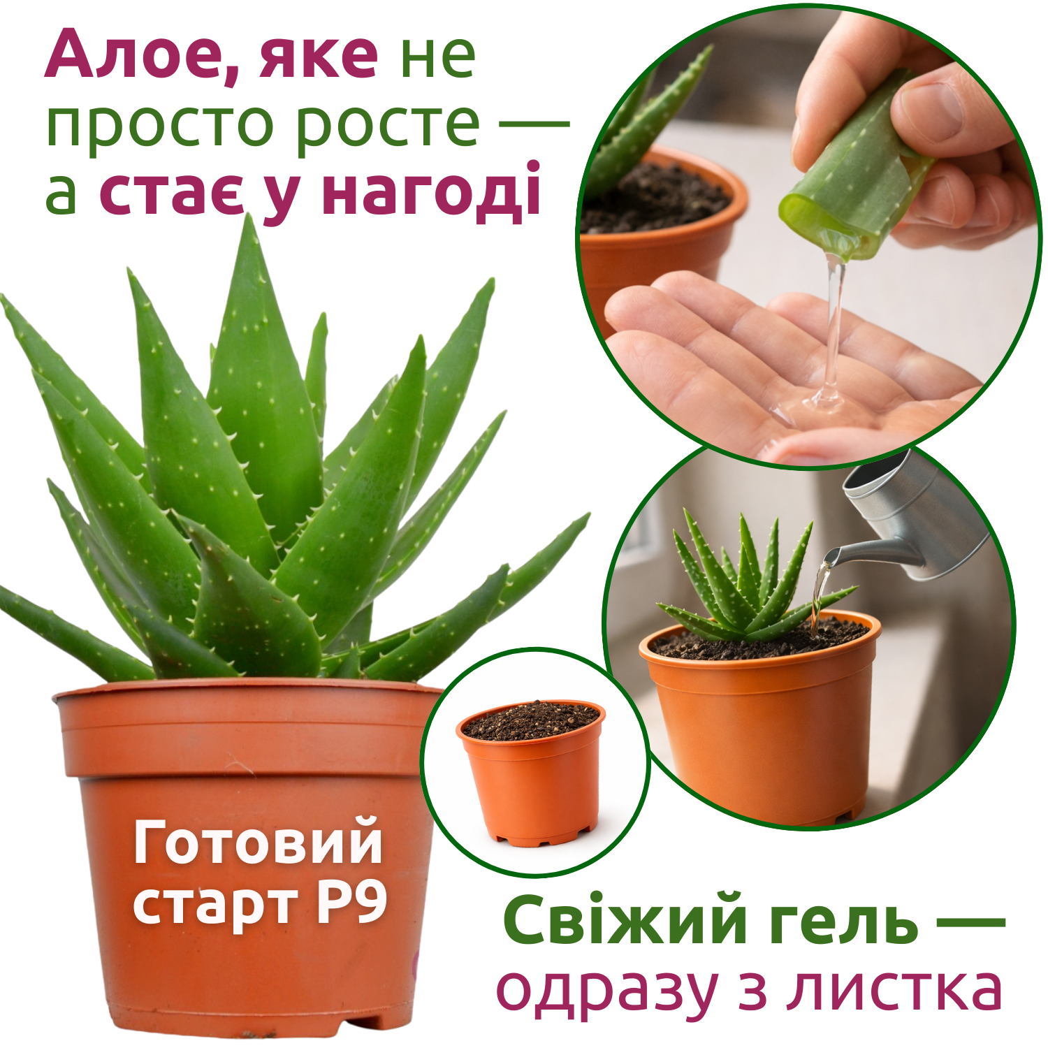 - Горщик P9 з підготовленим ґрунтом — нічого додавати не потрібно, усе вже підібрано для правильного росту алое.