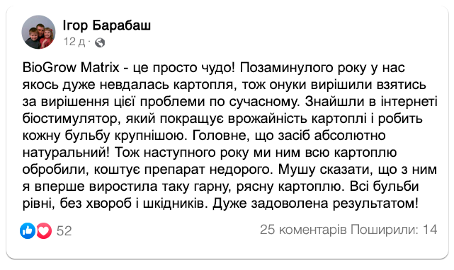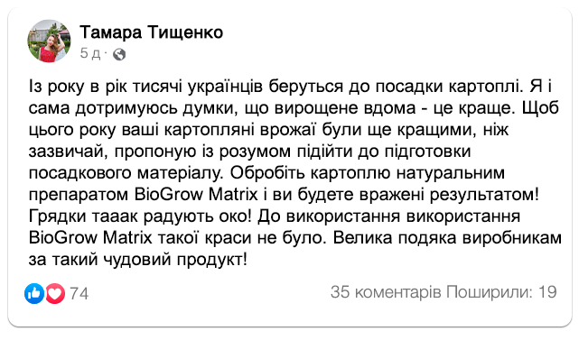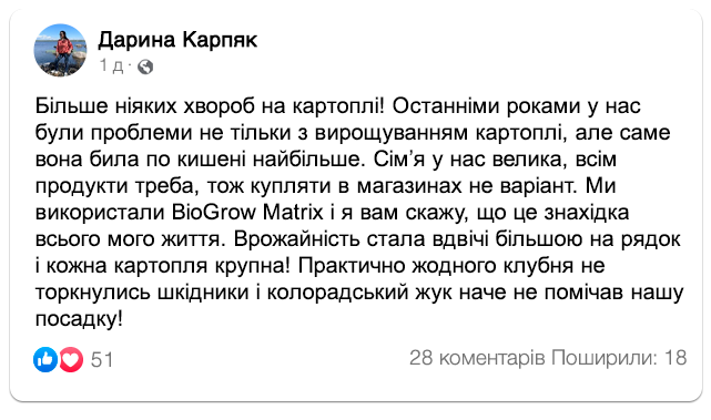"BioGrow Matrix" — біостимулятор нового покоління, що містить запатентований комплекс "VitaBoost+", який, у свою чергу, складається з екстракту морських водоростей, гумінових кислот, амінокислот і спеціально підібраного набору мікроелементів, оптимізованих для стимуляції росту та розвитку картопляних бульб. Виконавши попередню обробку посадкового матеріалу, можна запобігти розвитку хвороб культури, а також збільшити розмір плодів у 2-2.5 рази.