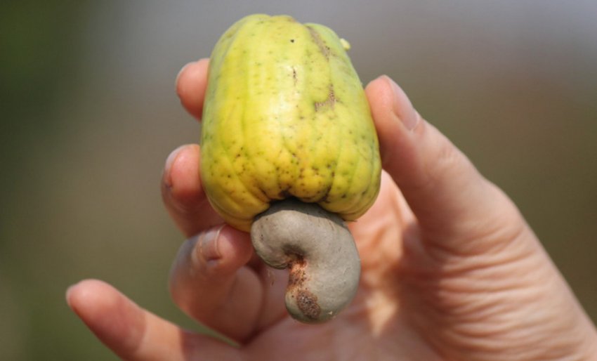 Насправді ця «груша» є плодоніжкою великої форми, а безпосередньо плодом кешʼю є той самий наріст, який розташовується внизу.