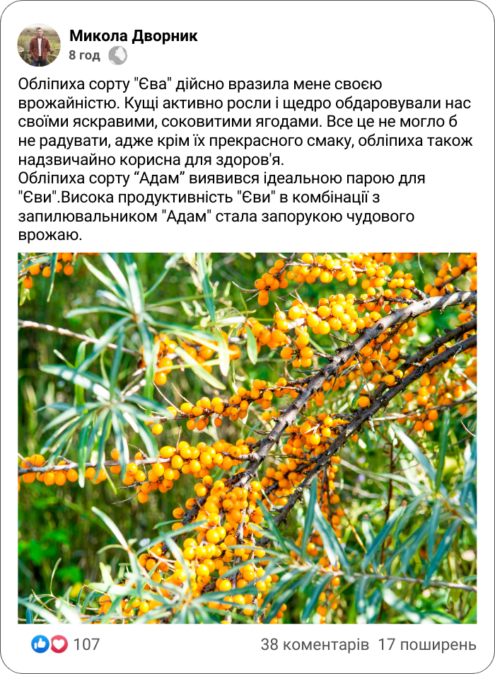 "Адам" та "Єва" - обліпиха, що вродить велику ягоду, та порадує щедрим врожаєм
