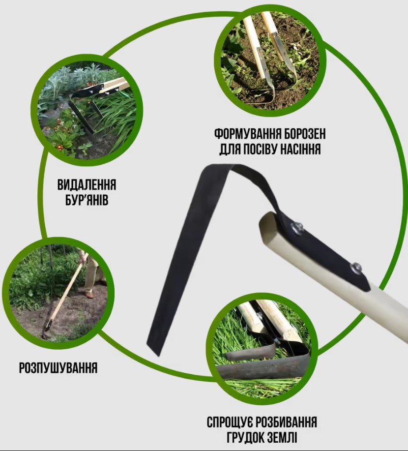 -замінює безліч іншого інвентарю (мотику, лопату, косу, граблі);