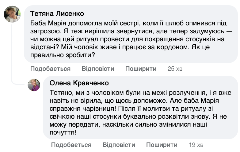 — Ох, доню, то давно було. Ще десь у двадцять із гаком років я це помітила. До мене тоді молоді дівчата почали звертатися, щоб їм допомогла: комусь хлопець не писав, комусь кохання нещасливе. І так воно пішло… Як мама казала, «Ти, Маріє, людей відчуваєш». Тож я навчилася правильні слова казати, щоб у серці любов загоїти або зміцнити.