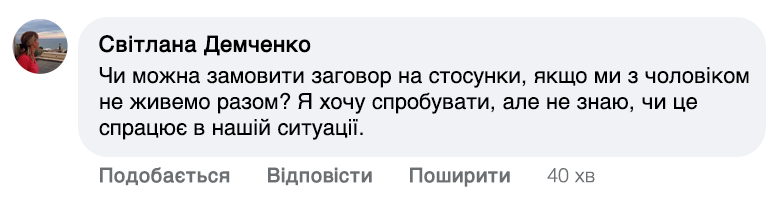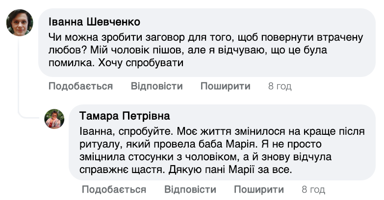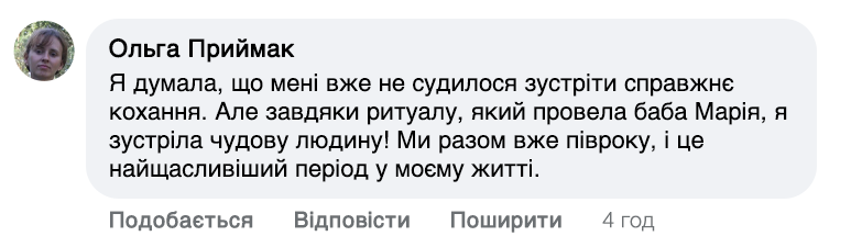Слова мають здатність відкрити серце для кохання чи зцілити вже існуючі стосунки. Раніше до мене їхали люди з усіх кутовчків України та не тільки. Та зараз я вже старенька. Ноги та зір підводять, але бажання допомагати не зникло. Роблю все можливо, щоб якомога більше людей пізнали щастя та любов!