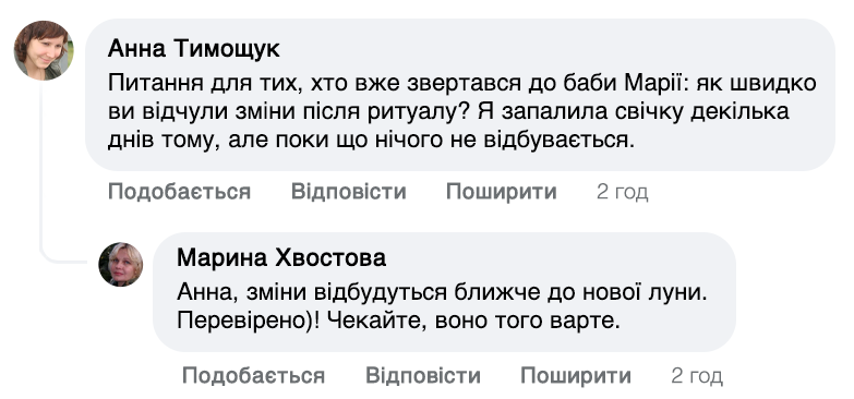 — Так, щоб молитва почала діяти, потрібна свічка, заговорена мною. А свічка то звичайна, віск та й усе. Головне— слова та молитва. Людині важливо опівночі її запалити та промовити ці слова: «Хай все станеться, як має статися, та буде — як буде. Коханням наповни мене та зціли». Тоді все й піде на лад.