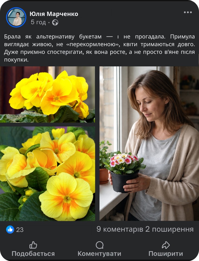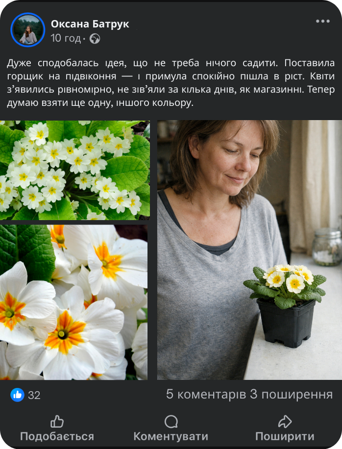 Наша примула — це інший підхід. Ми використовуємо спеціально підібраний поживний субстрат, у якому рослина може нормально рости, а не “доживати”. Насіння вже висаджене правильно, у стабільне середовище, без стресу від пересадок і різких змін. Саме тому примула не бореться за виживання — вона одразу запускає ріст і готується до цвітіння.