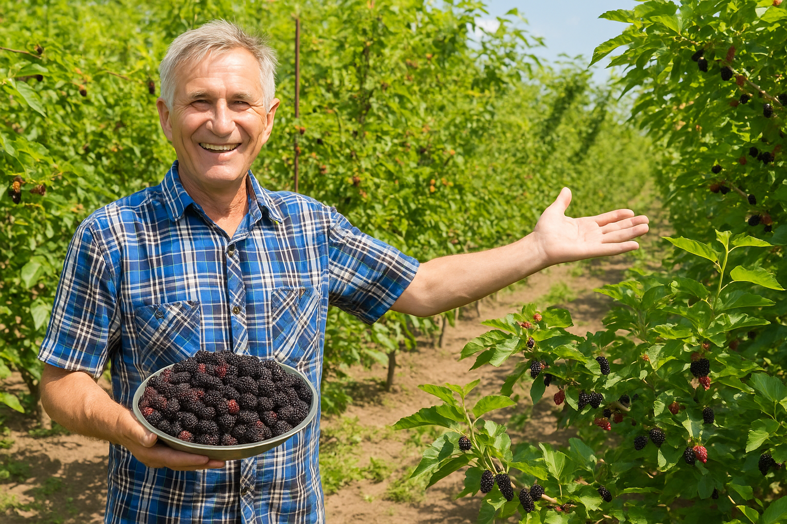 Черкаська область, 11 серпня 2025 року — Фермер із Черкащини Микола Гончар зібрав рекордний урожай шовковиці сорту “Чорна Баронеса”, отримавши понад 35 кг ягід з одного дерева. Плоди вражають розміром — до 4,5 см у довжину, насиченим темно-фіолетовим кольором та медовим смаком з легкою кислинкою.