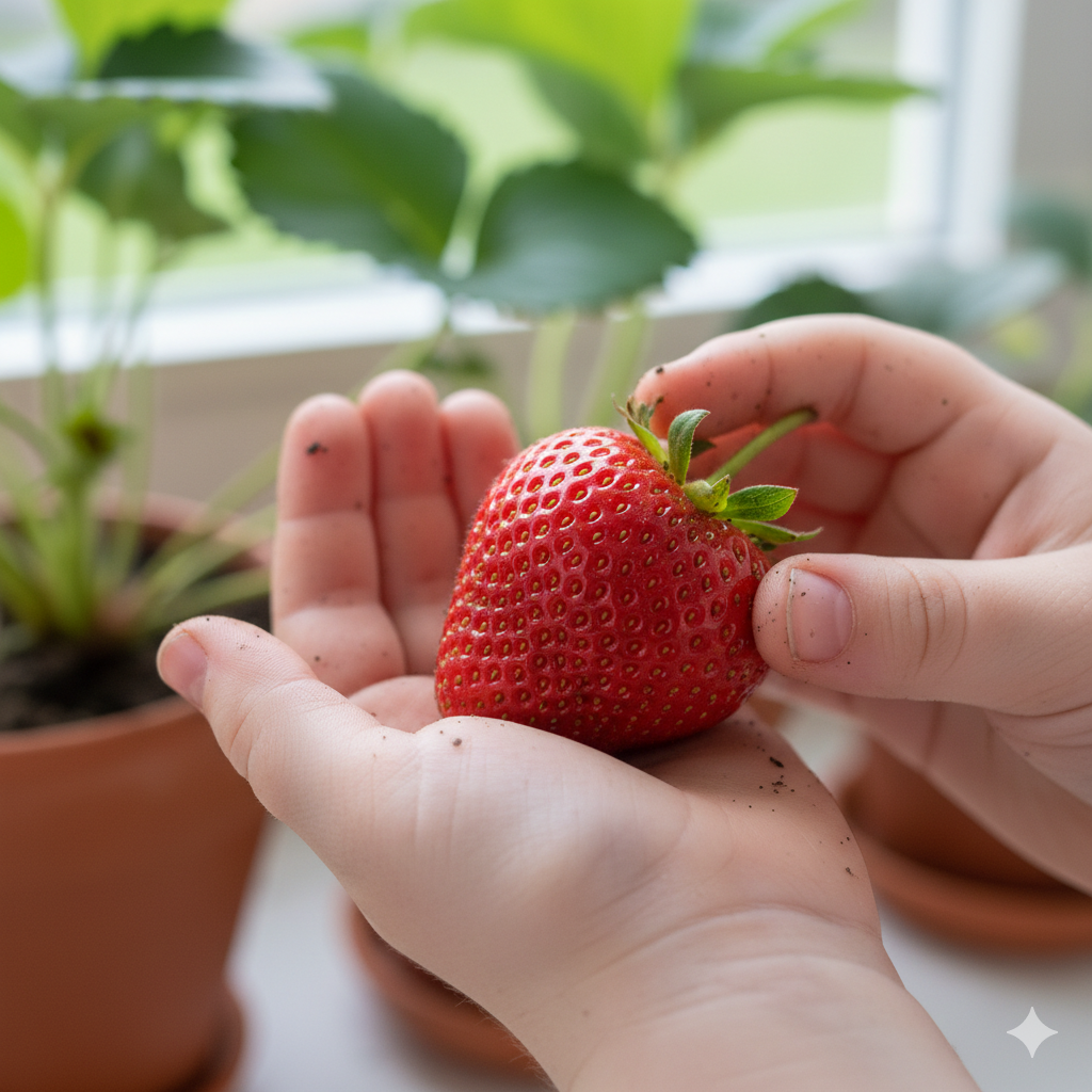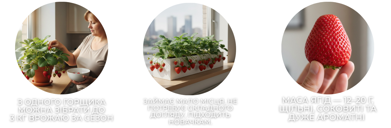 Ягоди великі, солодкі та дуже ароматні, масою 12–20 г, зі смаком, який зазвичай буває лише в літньої садової полуниці. Завдяки сильній кореневій системі та правильній селекції один горщик дає до 3 кг врожаю за сезон. Амелі невибаглива, стійка до хвороб, легко переносить квартирний клімат і підходить навіть новачкам. Це сорт, який створили для тих, хто хоче мати свою, натуральну, повністю безхімічну полуницю прямо вдома — зі смаком, ароматом і якістю, що недоступні покупним ягодам.