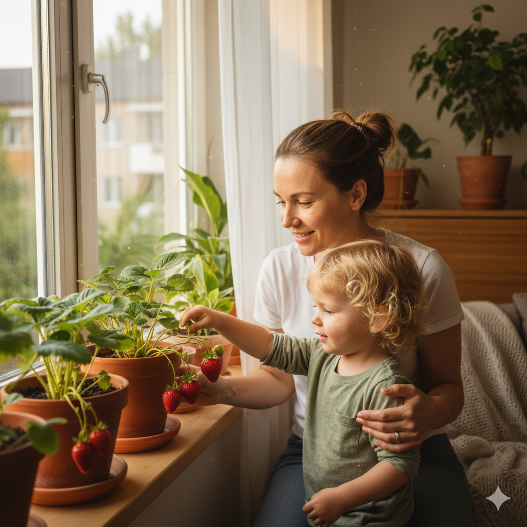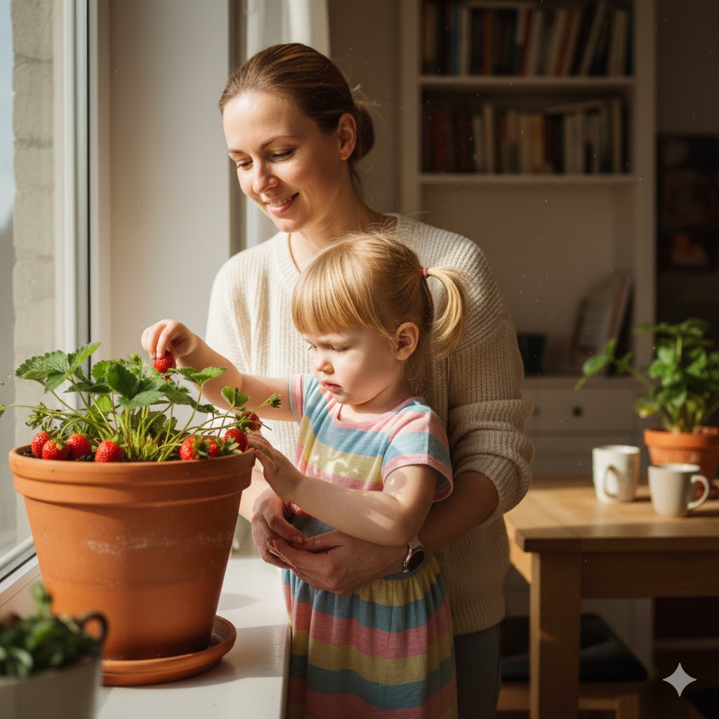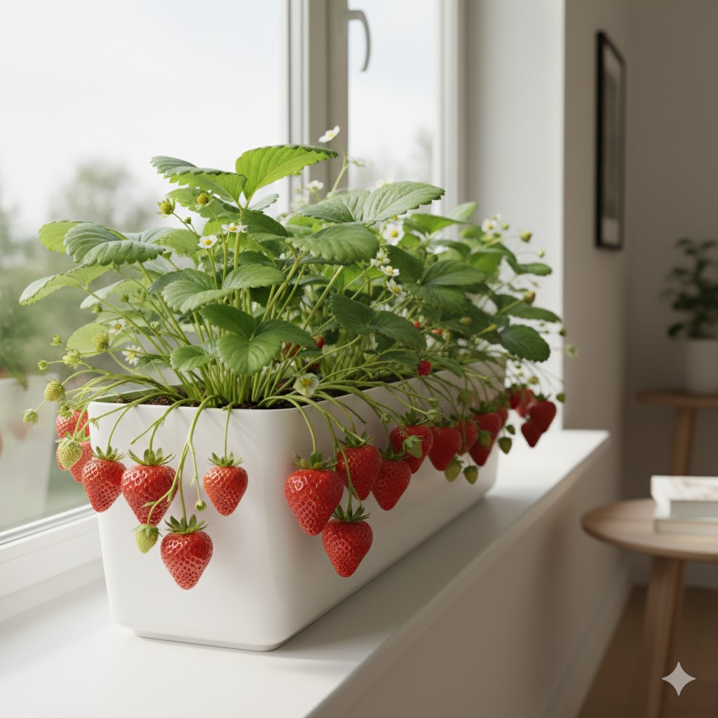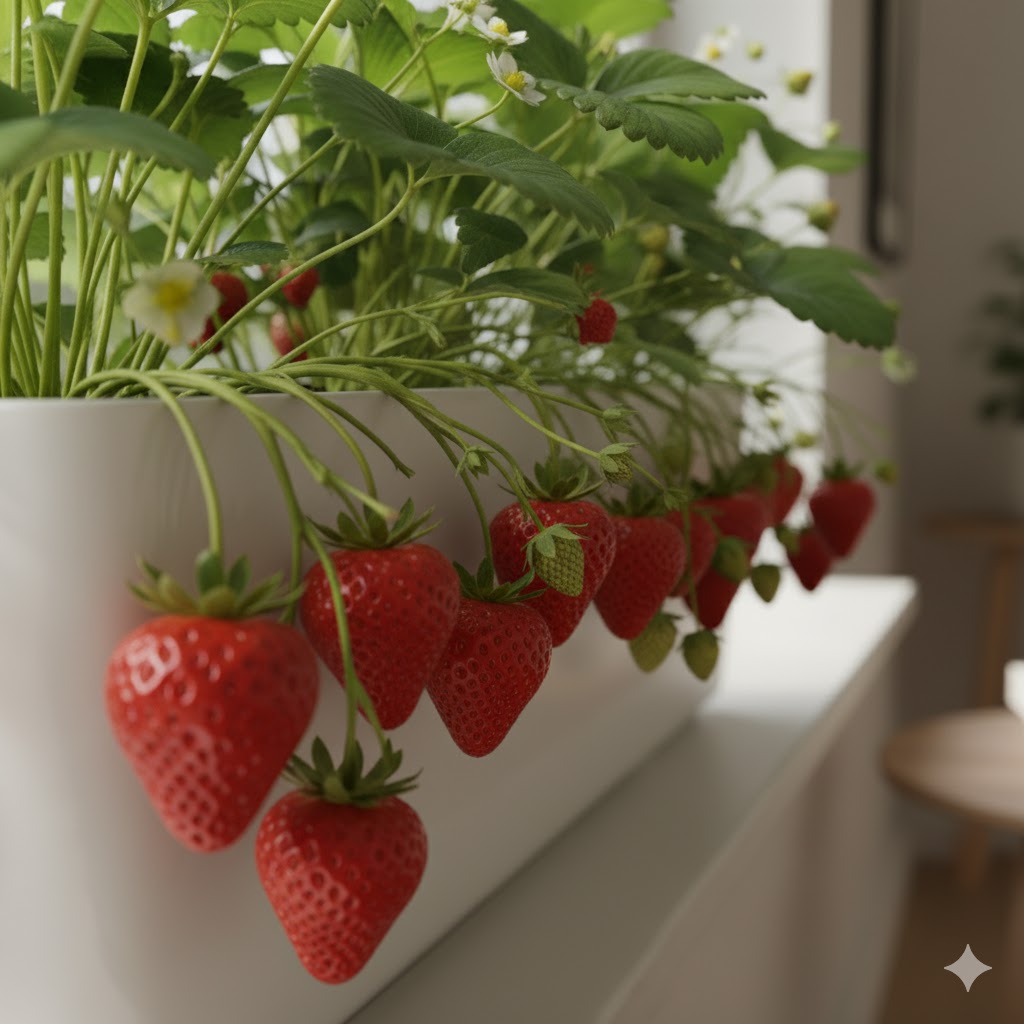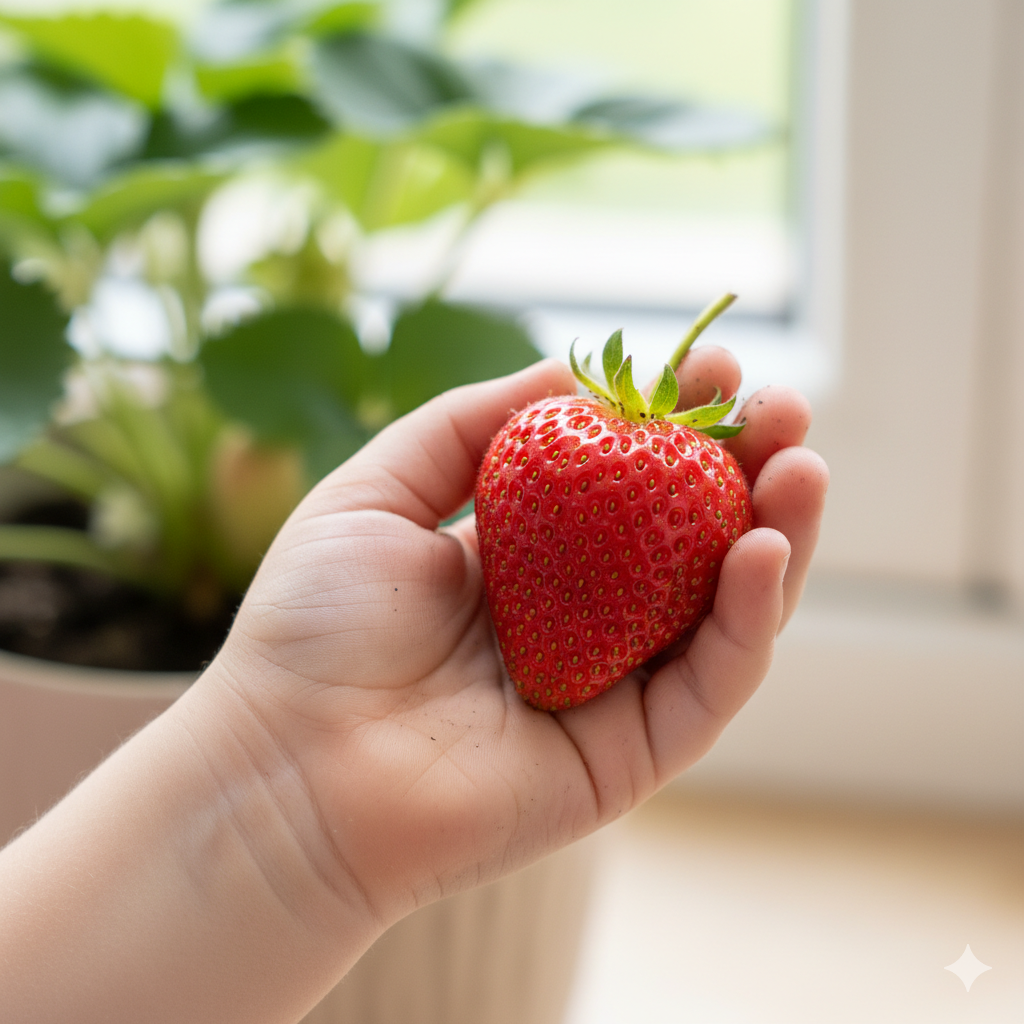 Амелі Кімнатна — це спеціально виведений у Європі ремонтантний сорт, створений селекціонерами саме для домашнього вирощування. Він поєднує стабільне плодоношення, компактний розмір і високу врожайність у маленьких горщиках. Кущики висотою 18–25 см легко розміщуються на будь-якому підвіконні, не розростаються та виглядають декоративно завдяки поєднанню білих квітів і червоних ягід. Амелі одночасно цвіте та плодоносить, тому свіжі ягоди вдома — це не сезонна рідкість, а постійна реальність.