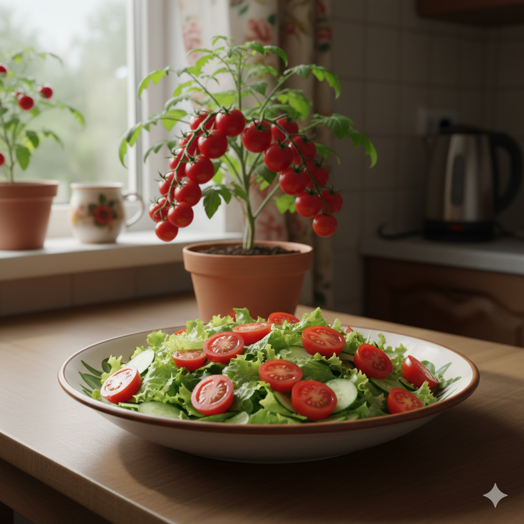 Редору взяла для салатів — смак просто ідеальний, як літні домашні помідори з городу. Кущ швидко прижився, дав багато зав’язі. З однієї рослини зібрала щонайменше півтора кілограма. Дуже зручно мати такий свій «город» прямо на підвіконні.
